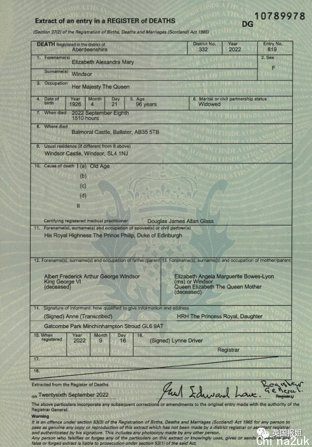 比来,英国女王逝世的死亡证实终于公布。