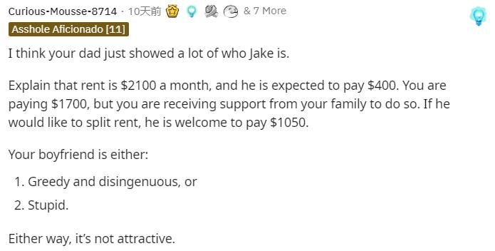 你要指出假如他真想和你平摊房租,那就让你爸全额收取房钱,也就是说他的那部份是1050美元!