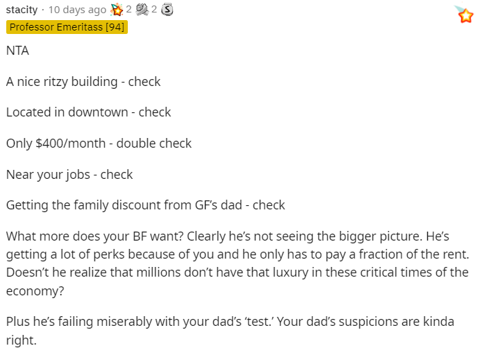 “一套位于市核心的奢华公寓,离下班地点又近,还从女友爸爸那儿失掉了家庭折扣,每月只需求400美元房钱!