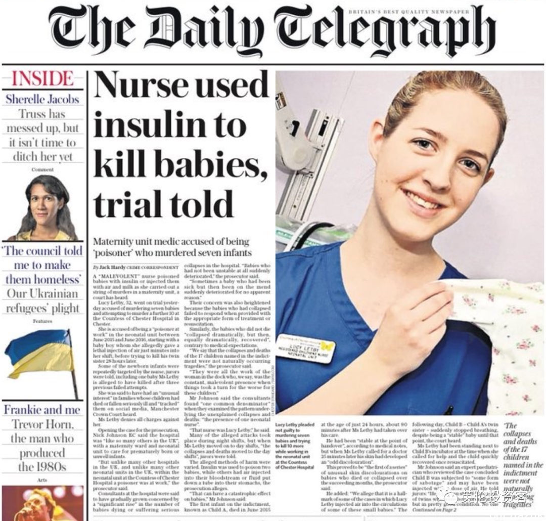 英国柴郡一产科护士被控成心杀害7名婴儿多家英国媒体今日头版报导称,英国东南部柴郡切斯特病院里一名名为露西(Lucy Letby)的产科护士,被指控在值班期间成心杀害了7名重生儿。该案于10月10日闭庭,露西自己对一切的谋杀指控都表现否定。