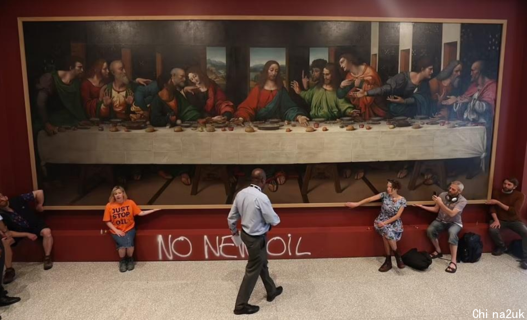 比来,“环保人士”似乎找到流量明码。上周,“拦住石油”还有两人爬上横跨泰晤士河的伊丽莎白二世女王大桥(Queen Elizabeth II Bridge)钢缆,致使大桥临时关闭。10月14日,有两人在伦敦国度美术馆(National Gallery),把装在罐头里的番茄汁泼向荷兰名画家梵高(Vincent van Gogh)的作品“向日葵”。而后用胶水把手粘在墙上大声抗议,要求英国住手一切新的石油和自然气名目。这两名抗议者之后被警察抓捕,《向日葵》因里面有一层玻璃维护而没有被破坏。