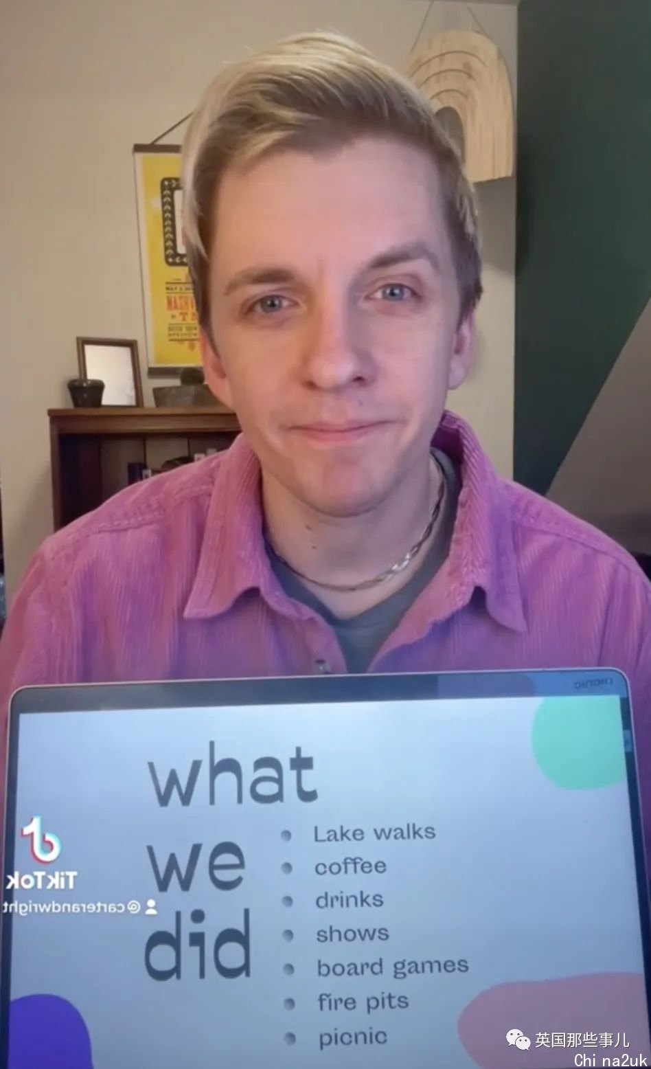 Carter的约会对象大多一样来自于各种约会软件,多数几个由于在社交网络上互发私信而意识,除了吃吃喝喝,约会时,他们还会一同去湖边、看上演、打桌游、扑灭篝火。