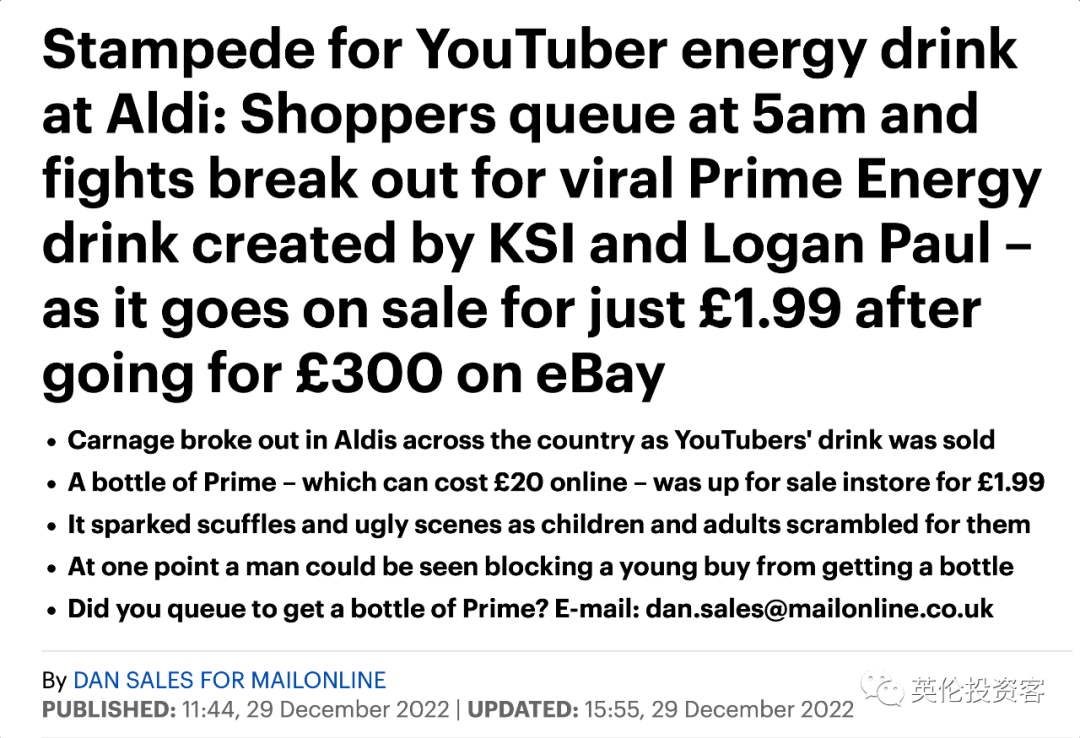 网红自创功用型饮料诱发英国年老人疯狂抢购油管上的拳击手网红Logan Paul和KSI创建了一款名为Prime的功用型静止饮料,在eBay上的价钱一度被炒到300英镑一瓶。