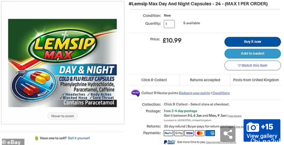 在亚马逊售价£4的Lemsip Day and Night胶囊在eBay上也被炒到了£10.99