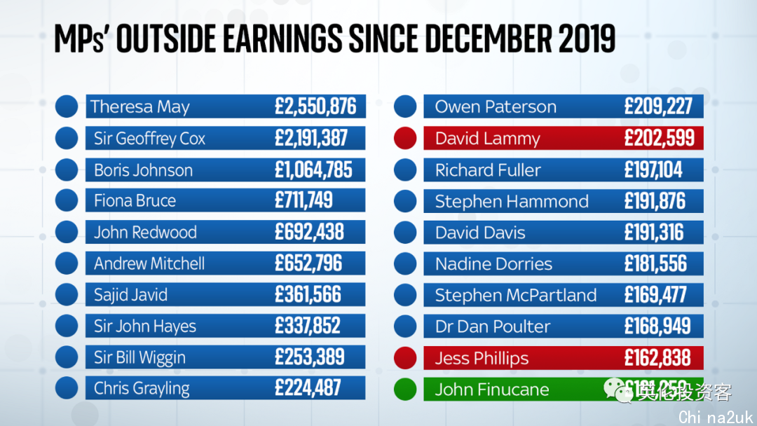 工资外支出榜单的前20大部份为激进党议员,工党也有两人上榜,其中较靠前的是工党影子内政大臣David La妹妹y。考察显示,2019年十二月以来,David La妹妹y列席了最少30次演讲和培训流动,获取人为约10万英镑,他还加入了伦敦播送公司的一个节目,赚取超过8.7万英镑人为。