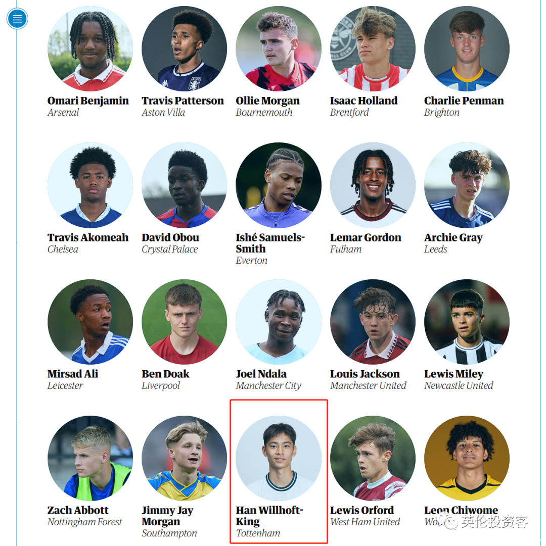 在清一色的白人/黑人球员中,托特纳姆热刺队(Tottenham Hotspur)的华侨小将金瀚(Han Willhoft-King)赫然在列。