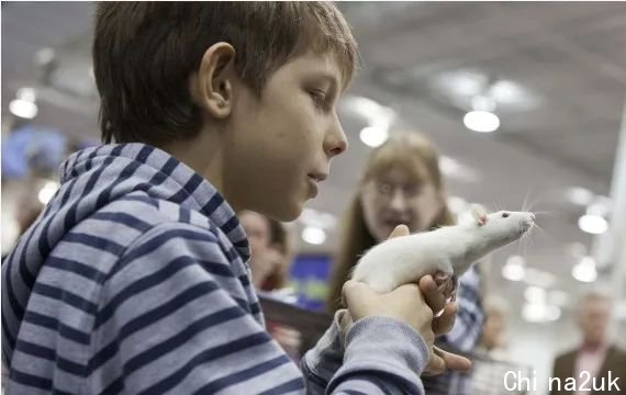 2014年4月18日,在加拿大多伦多,一个男孩和一只小白鼠游玩。(新华社发)