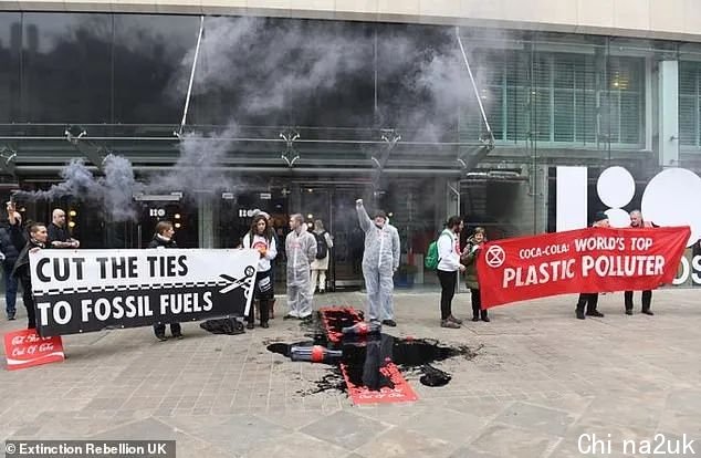 抗议者们在门口拉起大横幅,下面写着“割断与化石燃料的分割”、“可口可乐——世界上最大的塑料净化者”,高喊要求伦敦古装周保持可口可乐作为资助商的标语。