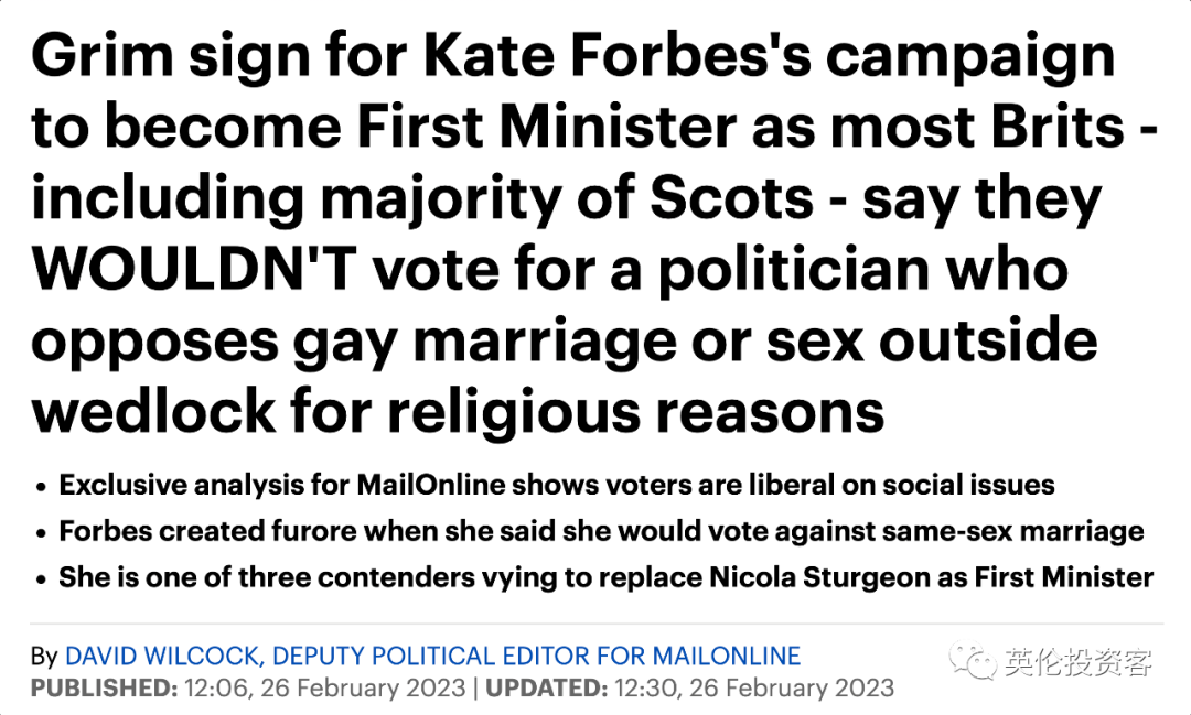 民调显示:宗教观念可能会让苏格兰财政大臣输掉竞选尼古拉·斯特金宣告辞职后,苏格兰财政大臣凯特·福布斯(Kate Forbes)成为接任她成为苏格兰民族党首领和苏格兰首席大臣的最抢手人选。在正式宣告参加竞选后的几小时,福布斯便对媒体表现,本人不会投票反对异性婚姻。作为一名虔诚的基督徒,她还支持非婚内的性行动,并表白过支持堕胎的观念。