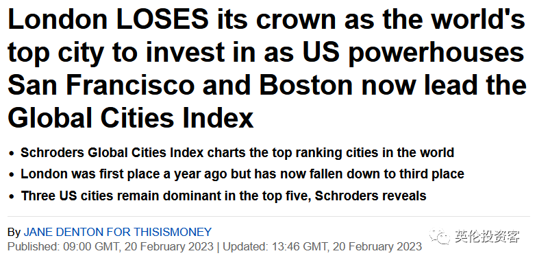 伦敦稳住前三宝座,还是欧洲第一城从上述榜单看出,因为旧金山、波士顿跃居施罗德寰球城市指数前两名,去年的冠军城市伦敦往年排名第三。至于其余英国城市,只要曼彻斯特排在第28位,没有其余英国城市入围该榜单。