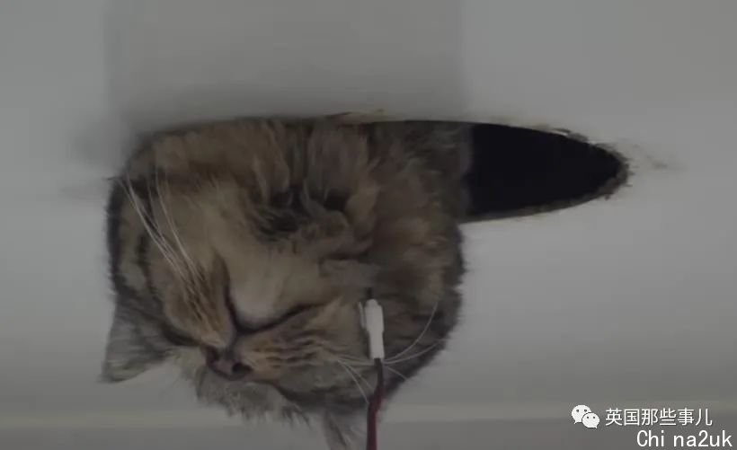 这只狸花猫似乎一点都不怕人,天花板关上之后它没有逃跑,也没有摆出攻打的姿势,只是待在天花板上,从另外一个装灯的孔洞里弹出头来,喵喵喵地叫着~