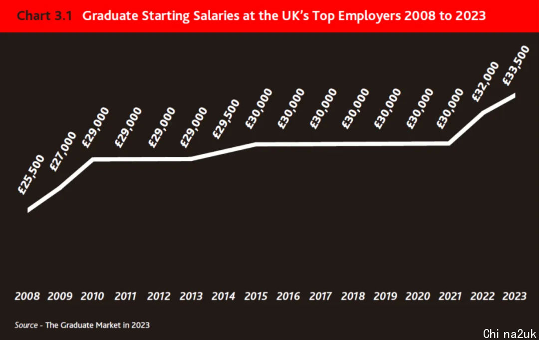 2010年-2021年期间,英国大学结业生起薪仅减少了1,000英镑,并延续7年放弃在30,000英镑。但在2022年-2023年,结业生起薪延续两年增长,预计2023年结业生起薪将达到为33,500英镑。
