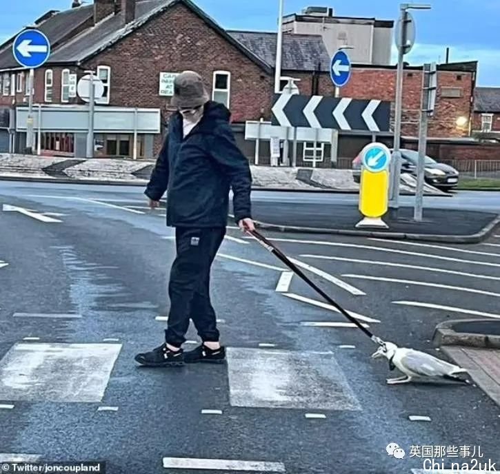 海鸥被他拽着往前走,从人行横道上穿过马路,看得出海鸥很顺从。