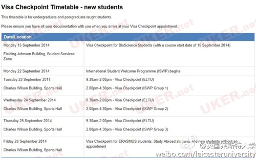 中英网11月4日讯 莱斯特大学发布新生注册通知,大家注意了!所有的国际学生除了要完成网上注册之外,还要去一对一的让学校检查有效签证,才能完成最终的注册。请大家查看下面的Visa Checkpoint Timetable: