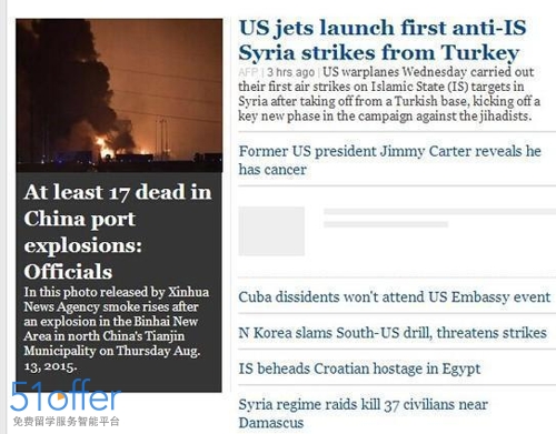 美国今日之声网站头条:中国港口城市天津发生爆炸,17人遇难,数百人受伤。