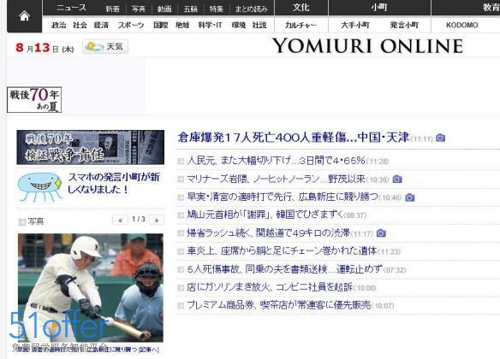 日本读卖新闻网站头条:中国天津仓库发生爆炸,17人遇难,400人重伤。
