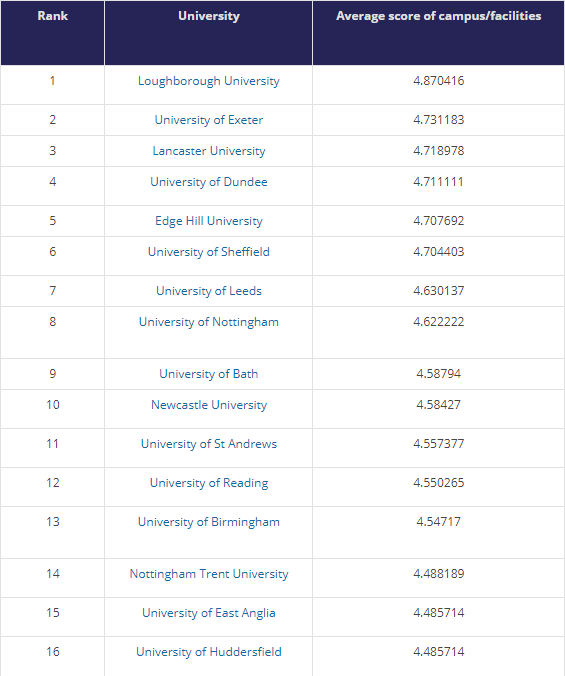 在Student Crowd针对7,849名学生的调查中,拉夫堡大学在校园/设施,俱乐部和社团,学生会和就业服务中获得五颗星,互联网/无线网络部分获得四星。 一位学生评论说:“拉夫堡的这些设施的质量非常高,整体校园氛围友好而热情。”