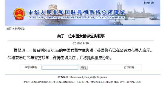 北约克郡警方在其网站以及推特上发布消息,称失踪女孩名叫Mei Chen(陈梅,音译),自2018年10月21日抵达英国以来,一直在斯卡伯勒国际学校学习。