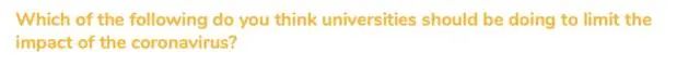 当问及中国留学生,高校最应该采取什么措施来控制疫情时,有56%的人认为应该把更多课程转移到在线教学。而有60%的人更关注学校对于学生身心健康的保障。