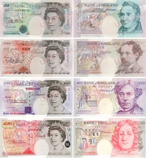 英镑的面额有:50镑、20英镑、10镑、5镑、2镑、1镑、50便士,20便士、10便士、5便士、2便士、1便士。