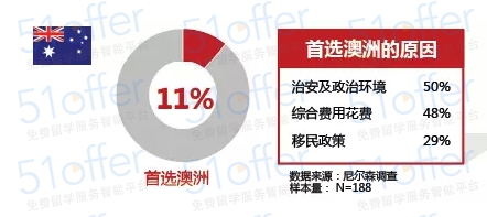 根据《白皮书》提供的数据,目前将澳洲作为留学目的地首选国家的人数共占总留学人数的11%。首先,澳洲相对理想的治安和环境也成了最吸引准留学生们的首要因素。其次,相比于美国、英国而言,赴澳洲留学所需的费用要少一些。