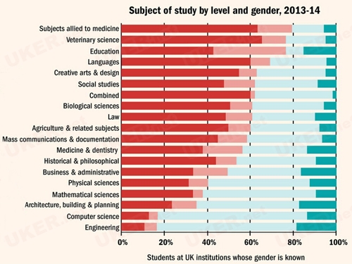 英国泰晤士高等教育《Times Higher Educat》发布英国大学各专业最新男女学生比例,根据英国大学委员会最新的统计数据得出。