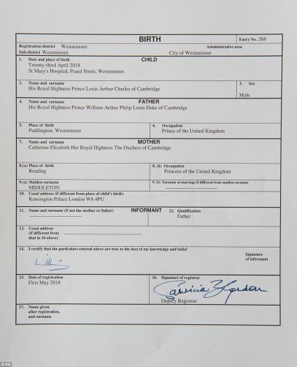 在姓名一栏,路易小王子的全名被登记为“剑桥的路易·亚瑟·查尔斯殿下”。
