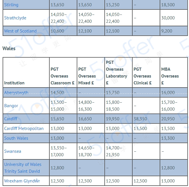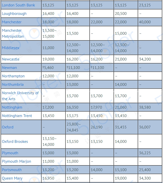 大学的学费因不同科目而异,部分取决于课程,比如是以课堂,实验室还是临床为基础。在硕士学位课程方面,学费的价格范围更广。《完全大学指南》统计了英国和欧盟学生,以及国际学生在英国大学进行全日制课程的学费。所有数字均由大学机构提供。“- ”表示没有提供数据。
